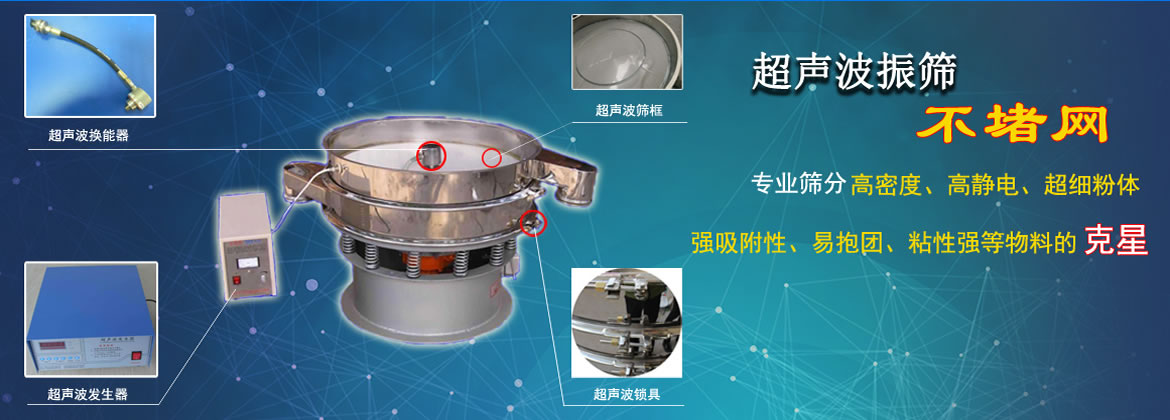 超聲波振動篩由超聲波諧振電源、振蕩器、外網(wǎng)環(huán)和共振環(huán)組成。篩網(wǎng)上的物料在做低頻三次元振動的同時,疊加上超聲波振動,既可防止網(wǎng)孔堵塞,又可提高篩分產(chǎn)量和質(zhì)量。有效的解決因團聚、靜電、強吸附性卡堵網(wǎng)孔等難題,是篩分行業(yè)的一項重大技術(shù)突破。