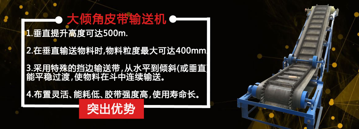 【產(chǎn)品介紹】:大傾角皮帶輸送機(jī)具有通用帶式輸送機(jī)優(yōu)點(diǎn),其結(jié)構(gòu)簡(jiǎn)單、運(yùn)行可靠,維修方便、結(jié)構(gòu)緊湊、占地少等特點(diǎn),輸送傾角為0°~90°范圍內(nèi),較大垂直輸送物料粒度為400mm